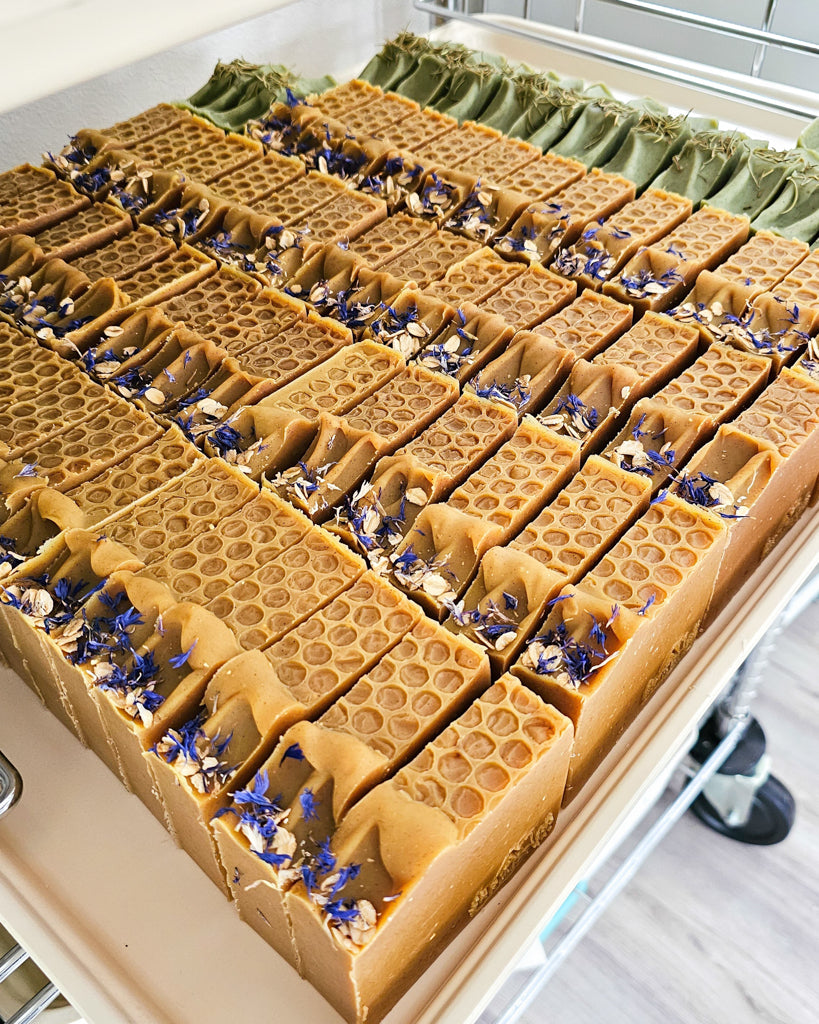Natural handmade soap prefers to avoid getting soggy or sitting in water. Make sure your soap gets time to breathe in between washes and uses. Store in a cool, dry place with ventilation. To help prolong the life of your bar, use a soap dish with ridges that prevent water from building up under your soap.